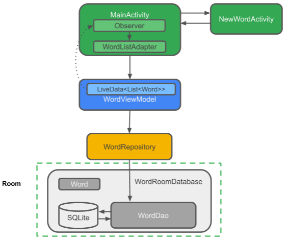 데이터 Insert 가 완료되면 onCreate() 내부에서 wordViewModel 이 allWords 데이터 변화를 감지합니다.