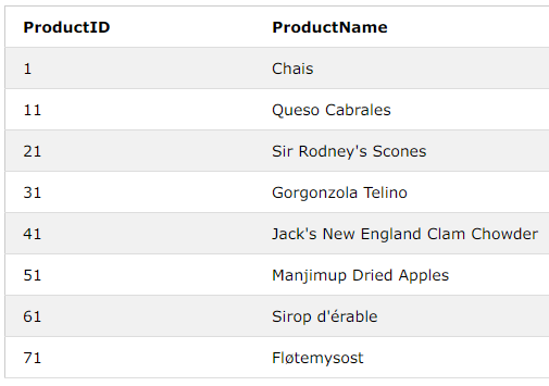 WHERE ProductID BETWEEN 10 AND 15;